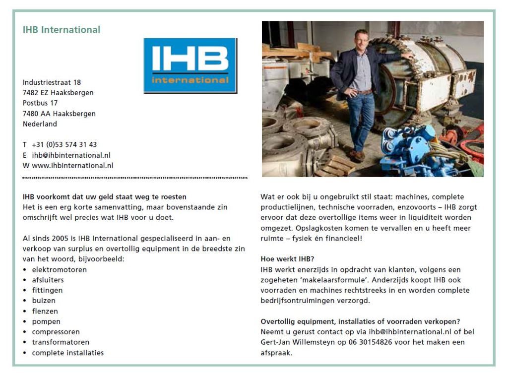 Al sinds 2005 is IHB International gespecialiseerd in aan- en verkoop van surplus en overtollig equipment in de breedste zin van het woord. IHB International zorgt ervoor dat overtollige items in liquiditeit worden omgezet, opslagkosten wegvallen en er weer ruimte beschikbaar komt, zowel fysiek als financieel. IHB International zorgt voor verkoop van uw overtollige machines, productielijnen, enzovoorts demontage, transport en opslag van materieel complete bedrijfsontruimingen inkoop van uw incourante voorraden afvoeren, recyclen of vernietigen van onverkoopbare machines Zet overbodige inventaris en incourante voorraden om in liquiditeit! Neem vandaag nog contact met ons op!